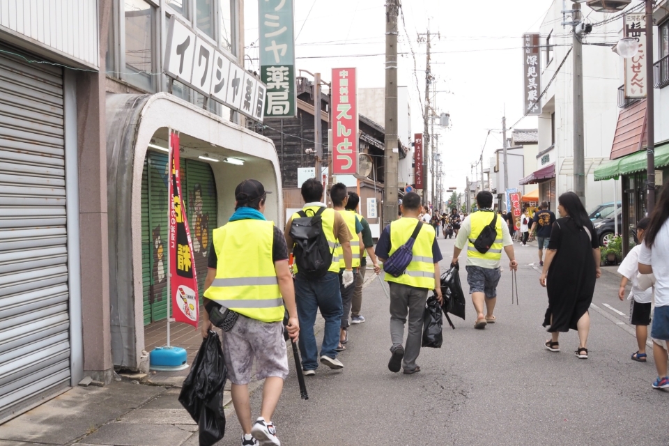 お祭りが行われている街中(区間)を2チームに分かれて、ゴミ袋&トングを持ってクルクル練り歩きながらゴミ拾いを行いました。