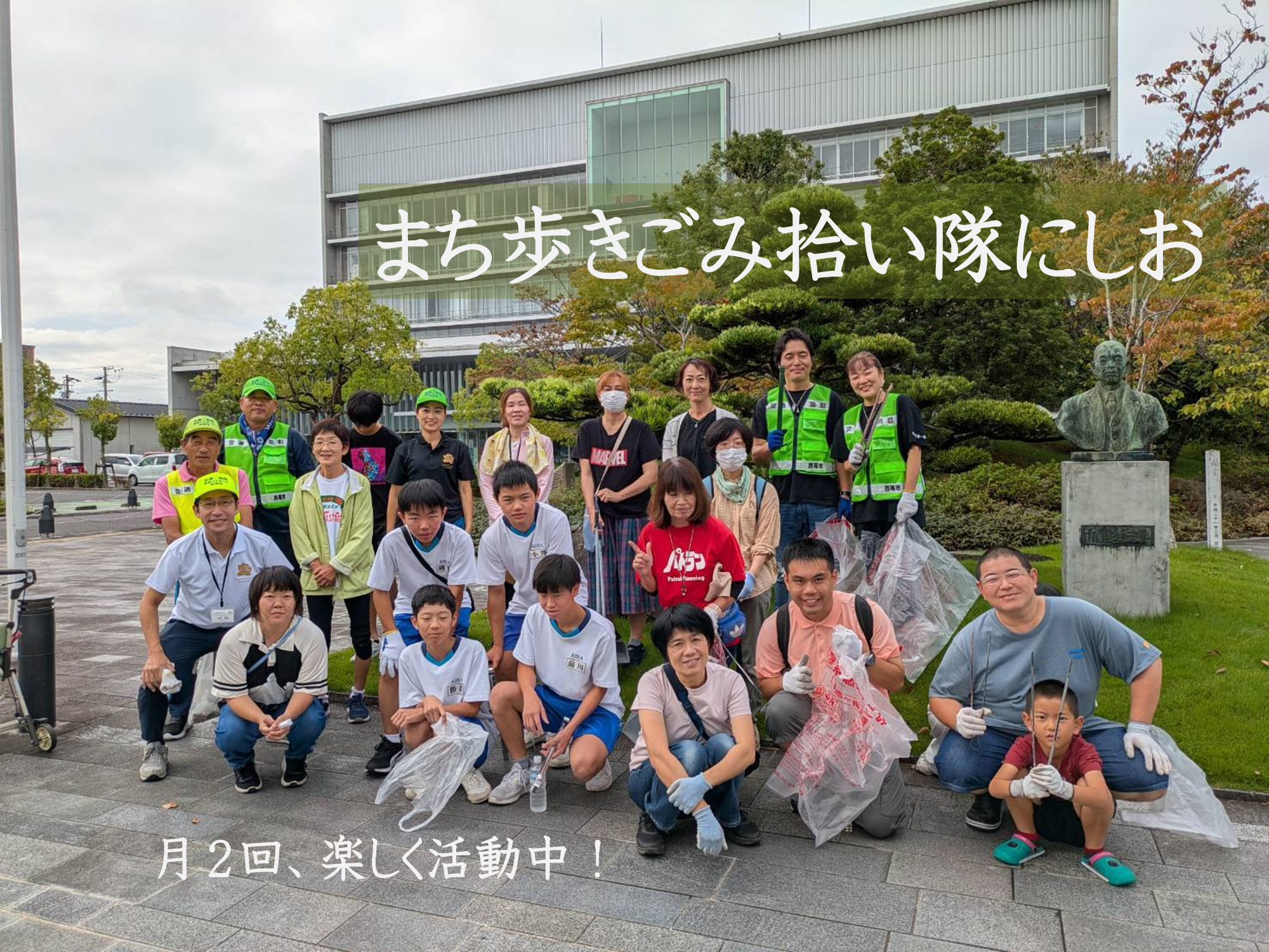 私たちが暮らす西尾市(主に市街地中心部)のごみ拾いを行う事で、ポイ捨てしない人づくりに務め、また公共の場所の巡視や破損などの通報を併せて行う事で、暮らしやすく住み良い綺麗なまち西尾市にして行く事を隊の目的にしております。