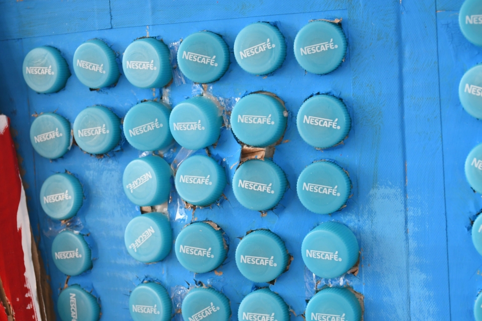 キャップアート専用の市販パネルは使用せず、身近なもので制作しようとダンボールを活用。キャップを設置する穴を一つずつ地道に空けてキャップを埋め込み、卒業を控えた2月末にトニーのキャップアートが完成しました。