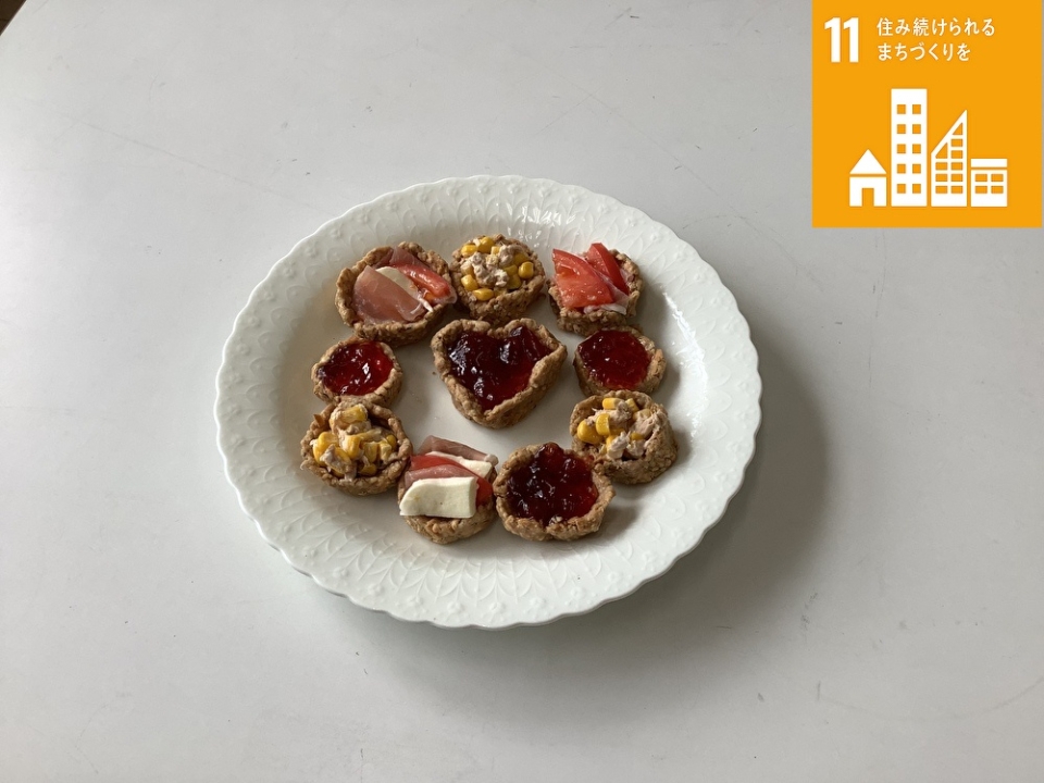 もう1つのグループは非常食の定番であるカンパンをタルトにアレンジ。パサつきがちなカンパンに、ジャムや缶詰を利用したサラダなどを合わせることでしっとりとした食感になり、見た目も味わいも華やかに。気分が沈みがちな被災時にも、笑顔が生まれそうな一品になりました。